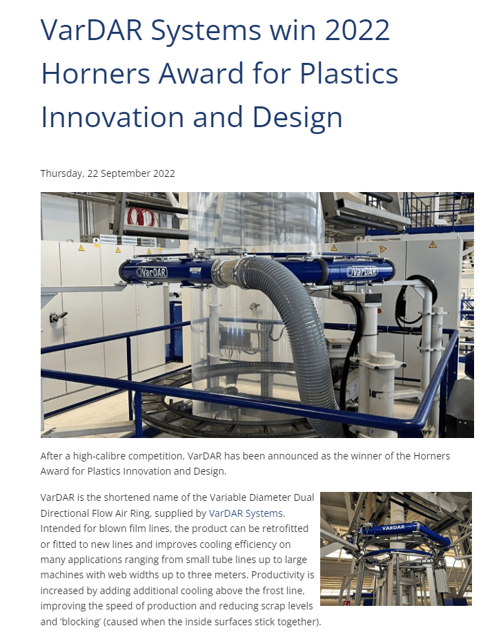 Hemos ampliado nuestra gama de productos y ahora suministramos varios sistemas VarDAR DDF para películas sopladas de mayor tamaño, de hasta 4 m. También hemos implementado otros procesos que facilitan las actualizaciones para que los clientes puedan supervisar la eficacia de la ventilación VarDAR DDF mediante la recopilación de más datos, la visualización y el almacenamiento de gráficos y tendencias para futuras consultas.